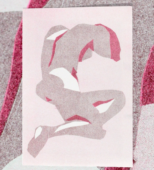 Hand printed two colour riso print of a life model, in fluorescent pink and burgundy. Printed on Cupcycle paper, with environmentally friendly soy inks.