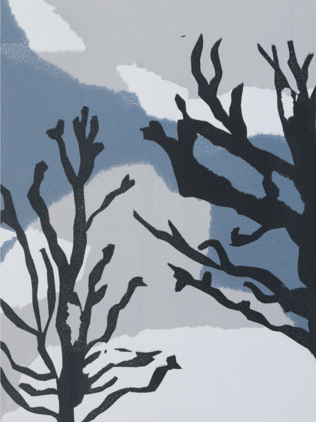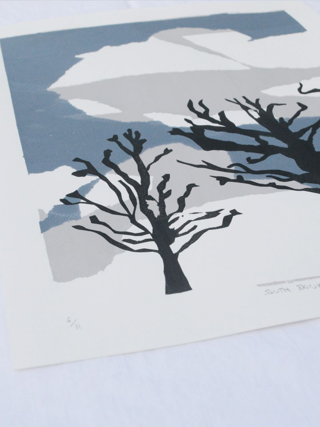 A roughly A4 sized screen print, inspired by a walk I took through South Bank, London on a cloudy day. Referring to photos from this walk, I wanted to evoke a moment of calm immediately before a change in the weather. I used newsprint stencils throughout, and made the stencil for each layer as I went along, reacting to the outcome of the previous layer.